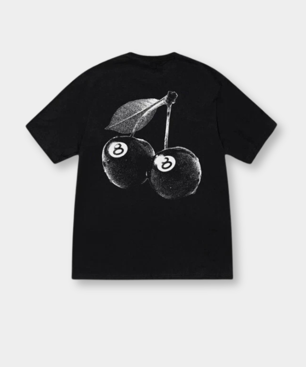Playera color Negro con logo "Stüssy" al frente y "Cherries" detrás